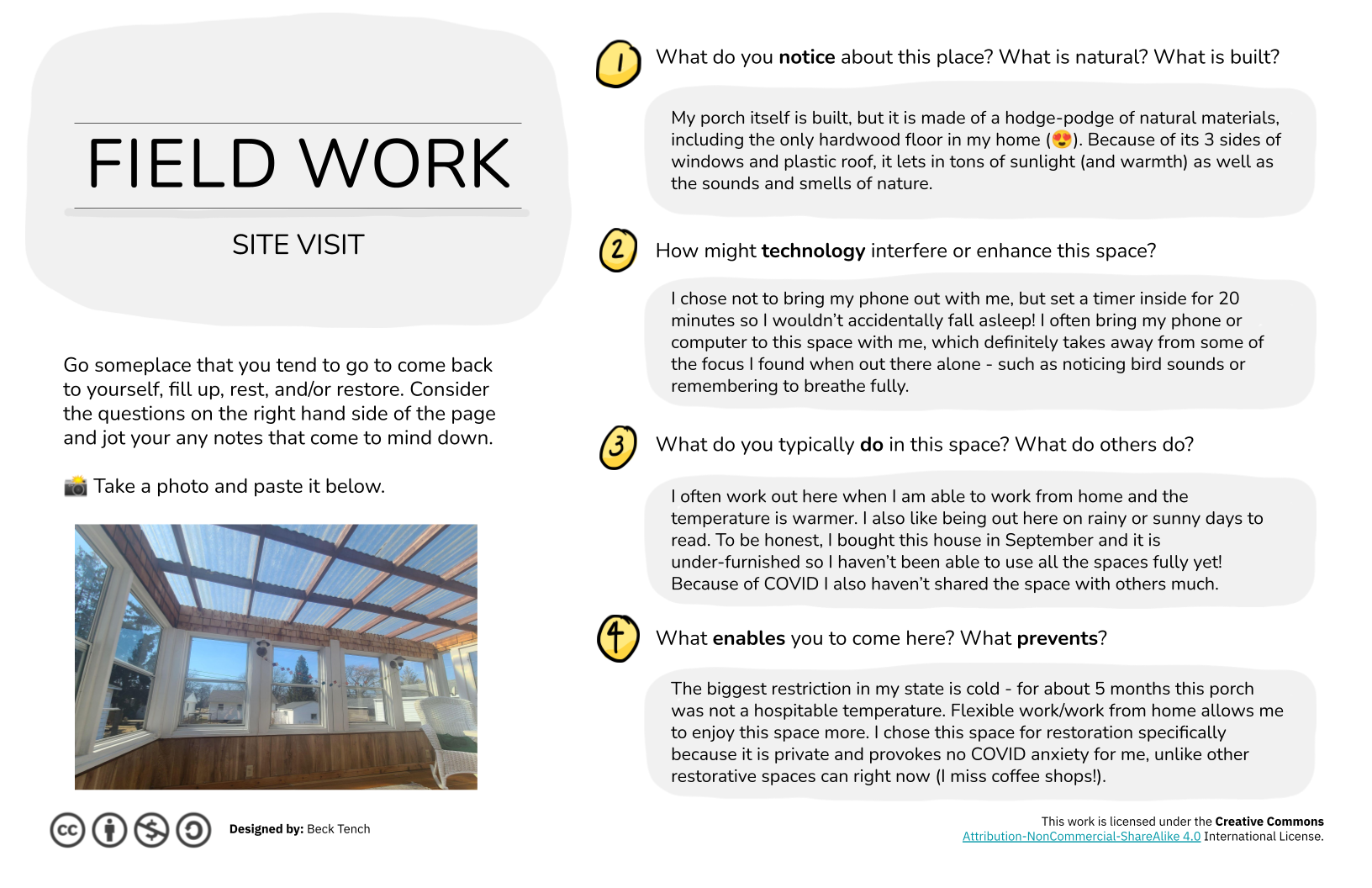 Part of the work of designing and discovering restorative environments is seeing the environments we spend a lot of time in with new eyes. This activity invites you to spend time in a restorative environment. It helps you to understand what you find restorative about it. It also may help you recognize tensions in that environment—elements that may compromise your restoration.