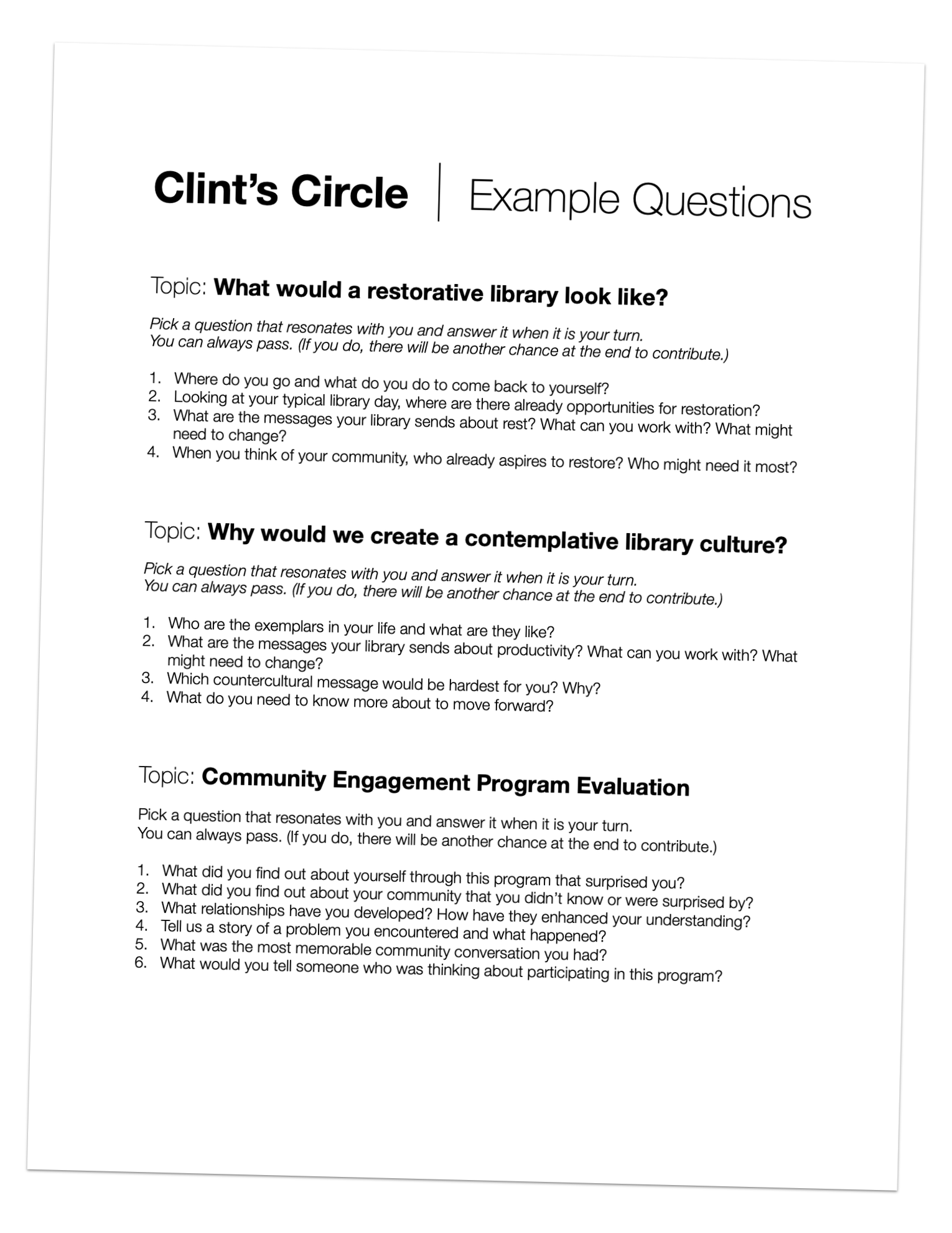 Clint’s Circle helps everyone in a group contribute to the conversation in a way that feels comfortable for them. It’s also a great way to practice presence while listening and speaking.